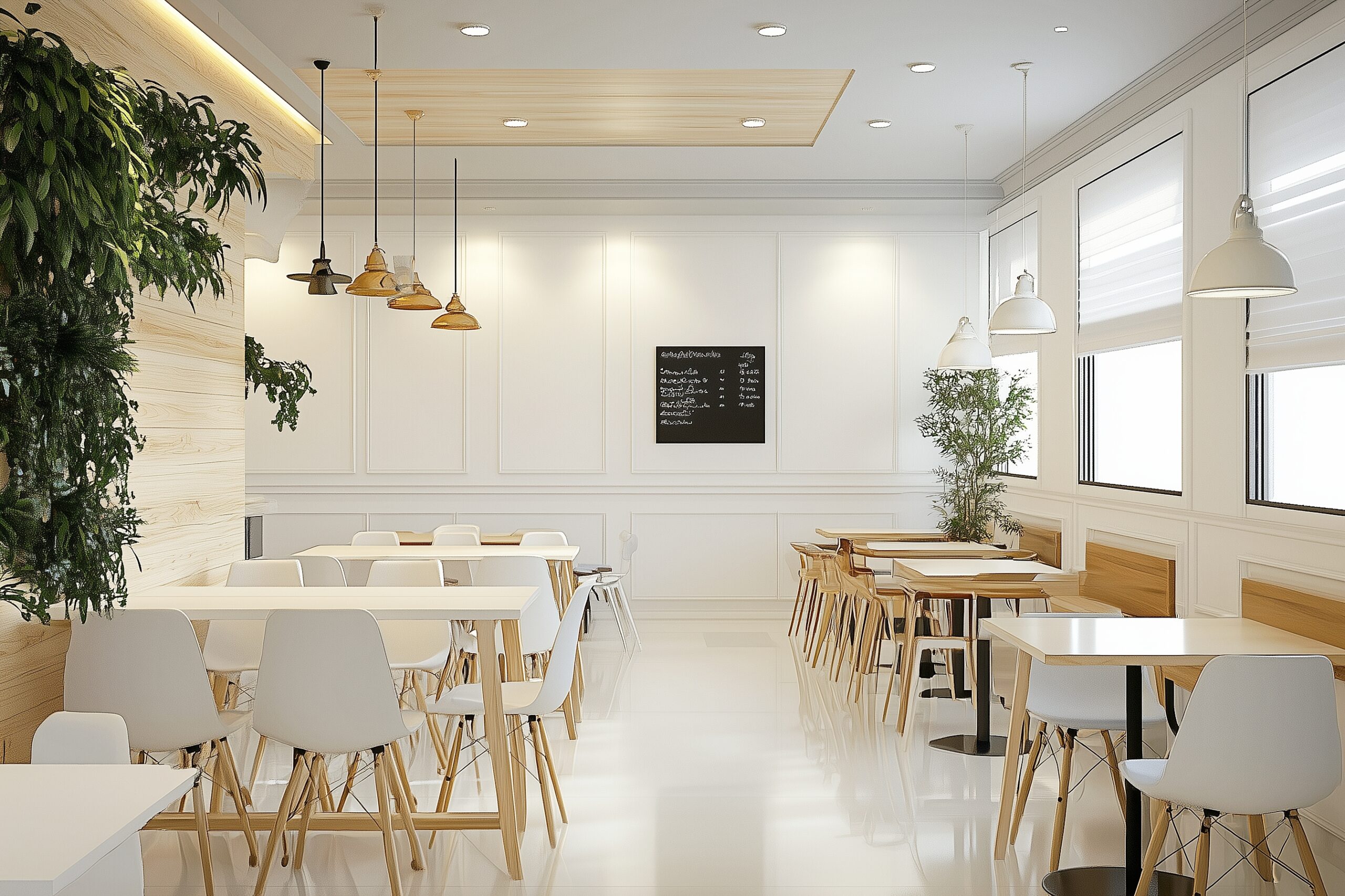 検索タグ:カフェ、インテリア、cafe、interior、店内、飲食店、オシャレ、お洒落、おしゃれ、フリー素材、フリー画像、AI生成画像、内装、内観、室内、店舗、お店、モダン、壁紙、ZOOM背景、配信用、背景素材、アイキャッチ、サムネイル、喫茶店、ナチュラル、素朴、テーブル、白、清潔感、ホワイト