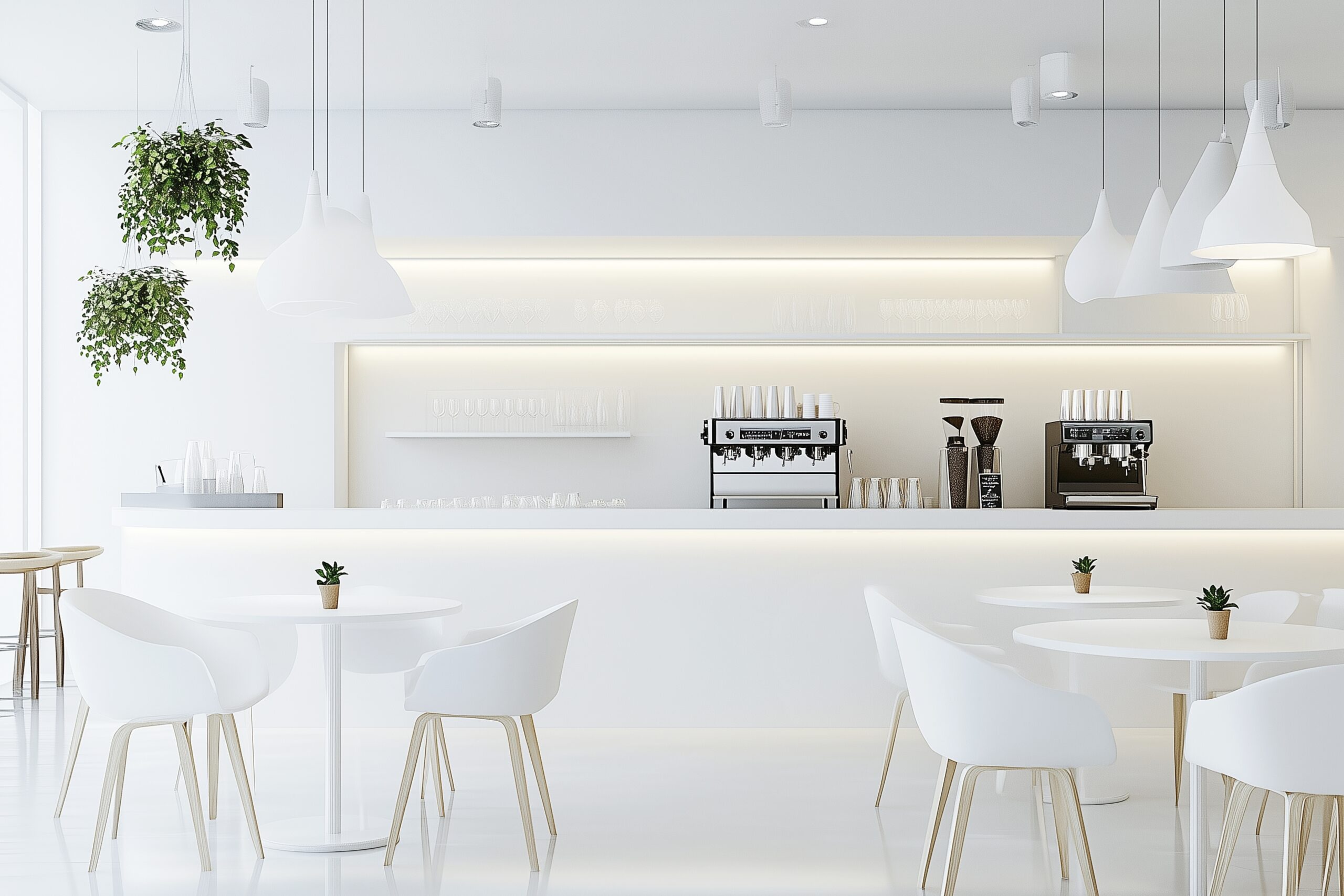 検索タグ:カフェ、インテリア、cafe、interior、店内、飲食店、オシャレ、お洒落、おしゃれ、フリー素材、フリー画像、AI生成画像、内装、内観、室内、店舗、お店、モダン、壁紙、ZOOM背景、配信用、背景素材、アイキャッチ、サムネイル、喫茶店、ナチュラル、素朴、テーブル、白、清潔感、ホワイト