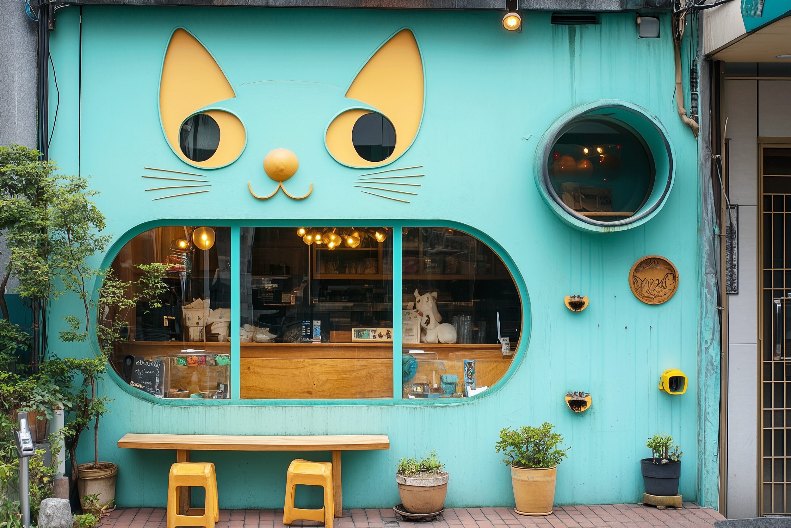 検索タグ:カフェ、cafe、飲食店、オシャレ、お洒落、おしゃれ、外観、建物、建築、お店、店舗、フリー素材、フリー画像、AI生成画像、レトロ感、海外風、、小さなカフェ、デザイン、画像、外装、無料画像、前景、カフェショップフロント、入り口、イメージ、猫、ネコ、ねこ、猫カフェ、架空、ファンタジー、可愛い、かわいい、カワイイ