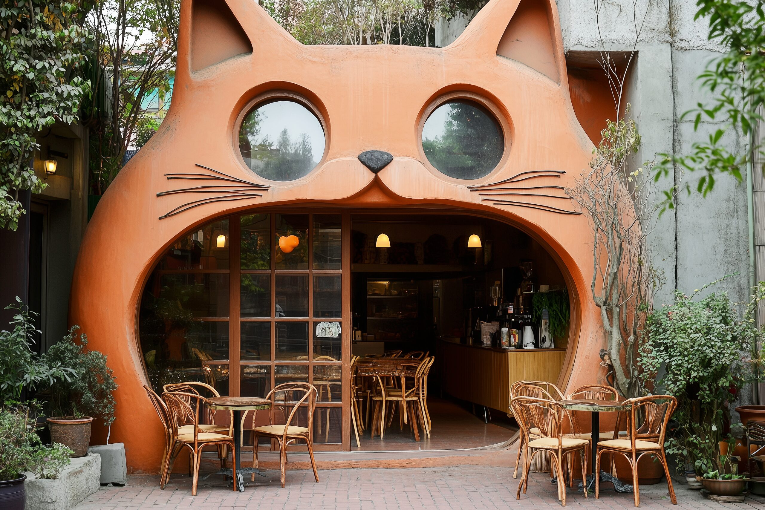 検索タグ:カフェ、cafe、飲食店、オシャレ、お洒落、おしゃれ、外観、建物、建築、お店、店舗、フリー素材、フリー画像、AI生成画像、レトロ感、海外風、、小さなカフェ、デザイン、画像、外装、無料画像、前景、カフェショップフロント、入り口、イメージ、猫、ネコ、ねこ、猫カフェ、架空、ファンタジー、可愛い、かわいい、カワイイ