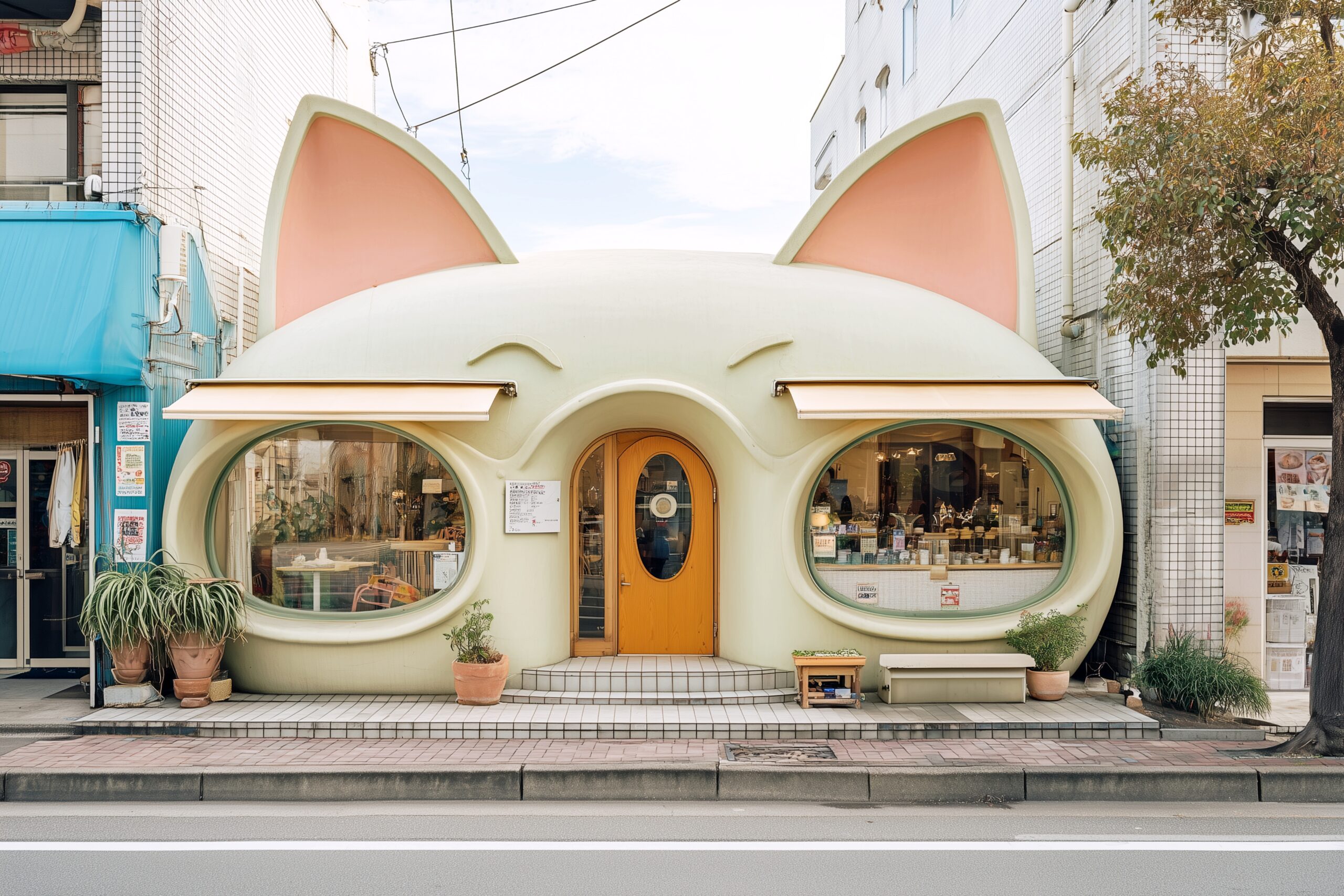 検索タグ:カフェ、cafe、飲食店、オシャレ、お洒落、おしゃれ、外観、お店、外装、店舗、フリー素材、フリー画像、AI生成画像、喫茶店、Store、デザイン、かわいい、可愛い、カワイイ、キュート、cute、イメージ画像、モダン、Design、猫、ネコ、ねこ、猫カフェ、ねこカフェ、ネコカフェ、猫型カフェ、イメージ素材