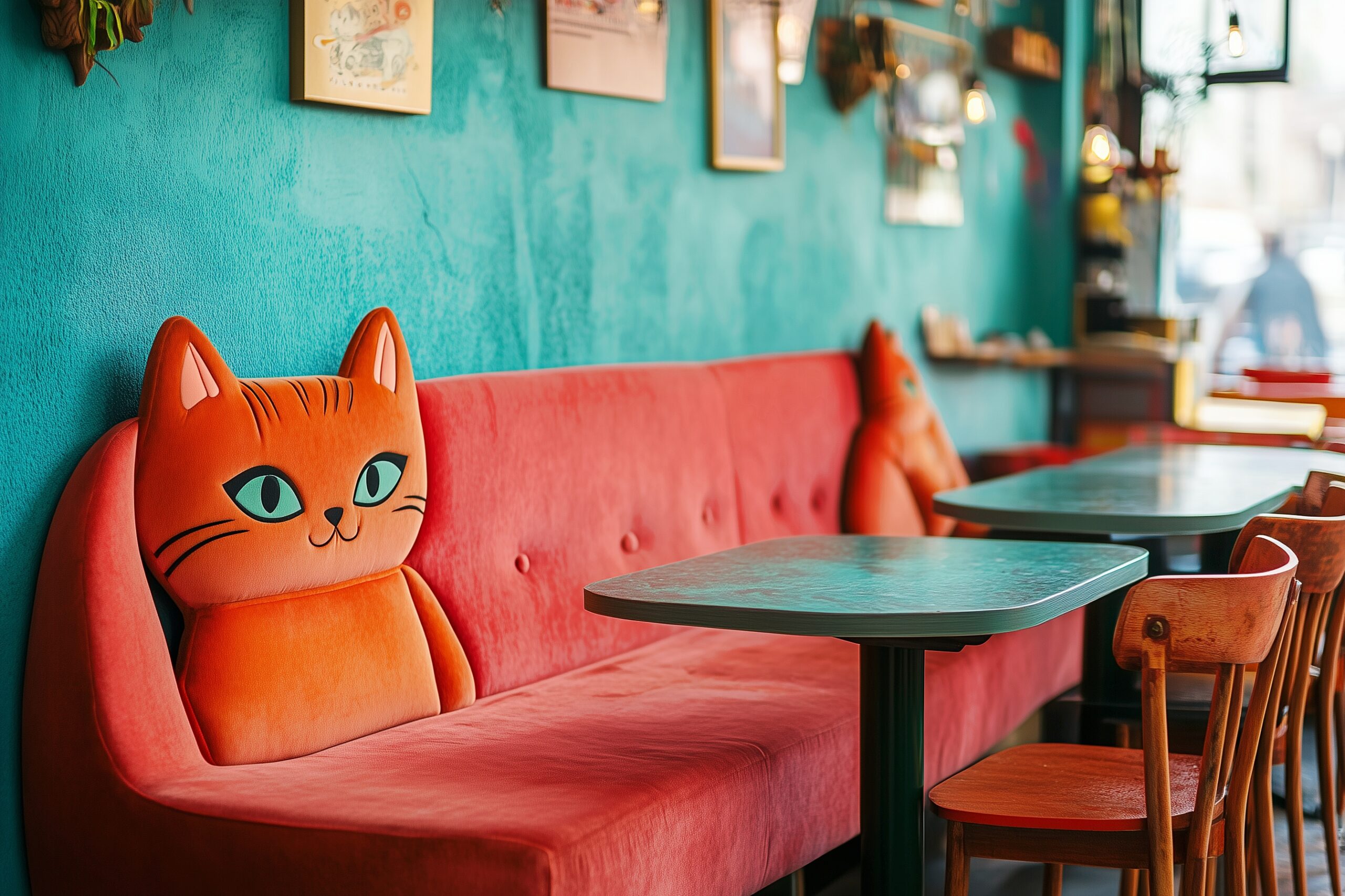 検索タグ:カフェ、インテリア、cafe、interior、店内、飲食店、オシャレ、お洒落、おしゃれ、フリー素材、フリー画像、、free、image、materials、AI生成画像、内装、内観、室内、店舗、お店、モダン、壁紙、ZOOM背景、配信用、背景素材、アイキャッチ、サムネイル、喫茶店、レトロ、猫、ネコ、ねこ、猫カフェ、ソファ席、猫型、可愛い、かわいい、カワイイ、kawaii、クッション、kitty、cat