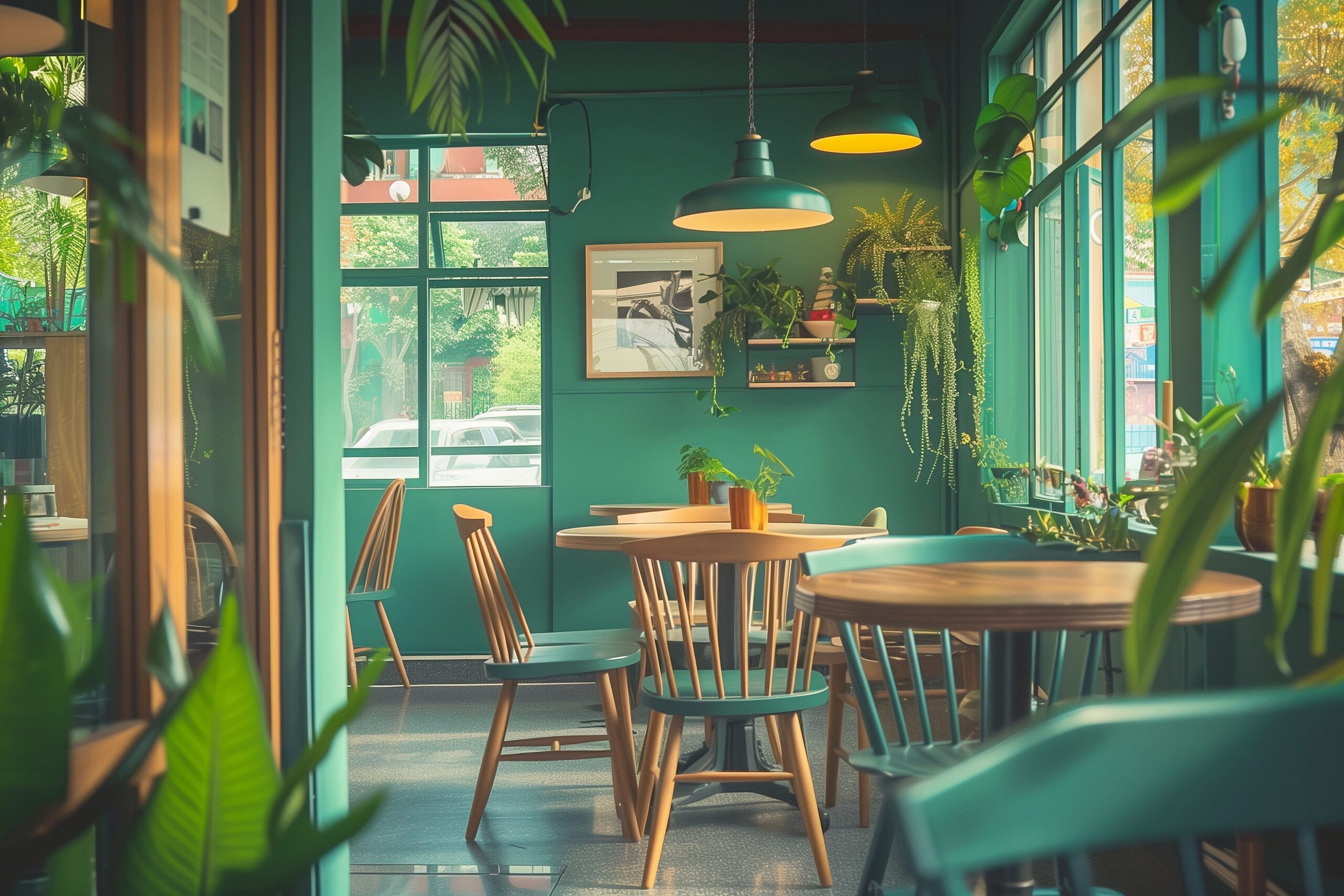 検索タグ:カフェ、インテリア、cafe、interior、店内、飲食店、オシャレ、お洒落、おしゃれ、室内、屋内、内装、内観、フリー素材、フリー画像、AI生成画像、木のテーブル、シンプル、コピースペース、緑、グリーン、Green、レトロ感