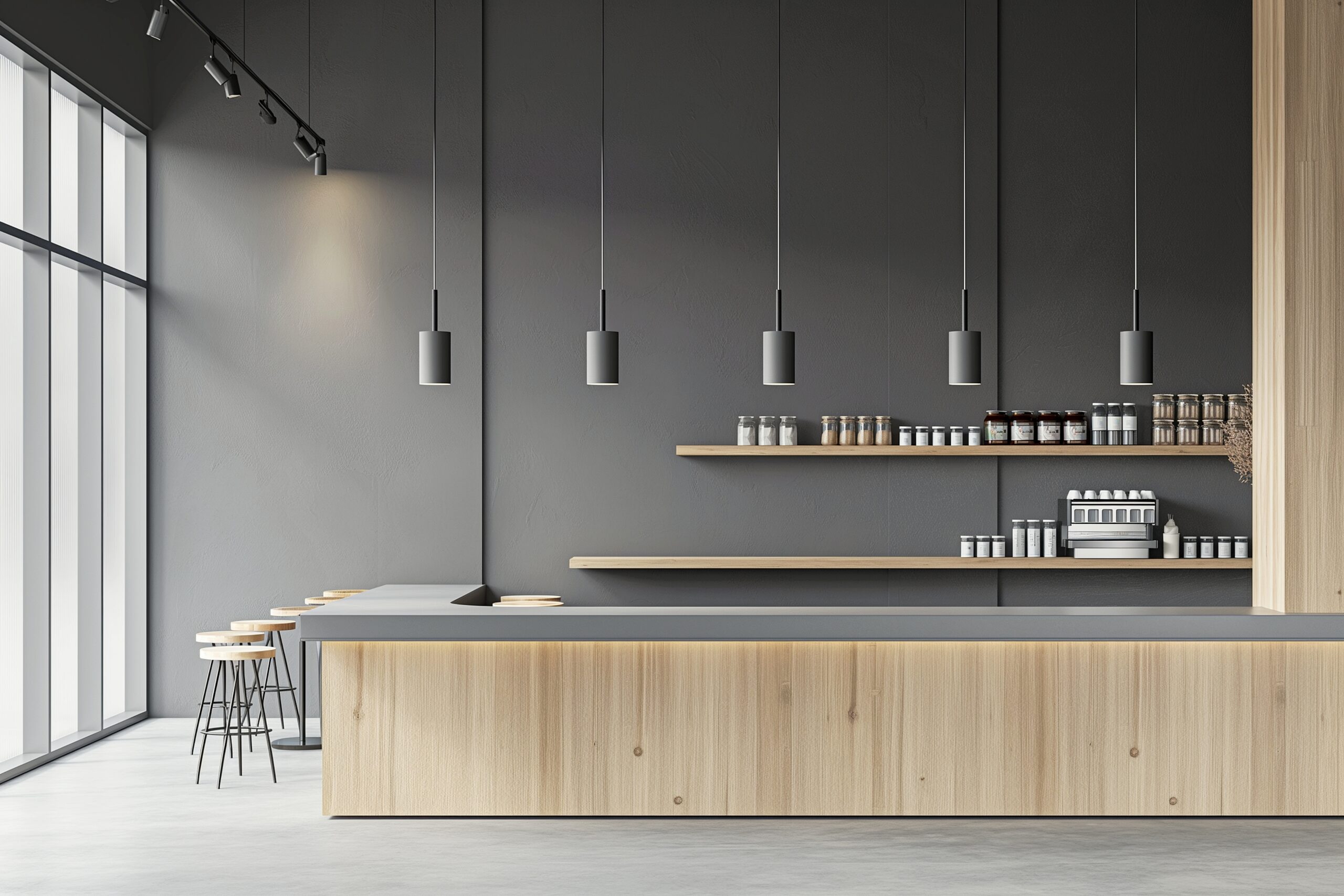 検索タグ:カフェ、インテリア、cafe、interior、店内、飲食店、オシャレ、お洒落、おしゃれ、室内、屋内、内装、内観、フリー素材、フリー画像、AI生成画像、木のテーブル、シンプル、コピースペース、グレー、コンクリート調