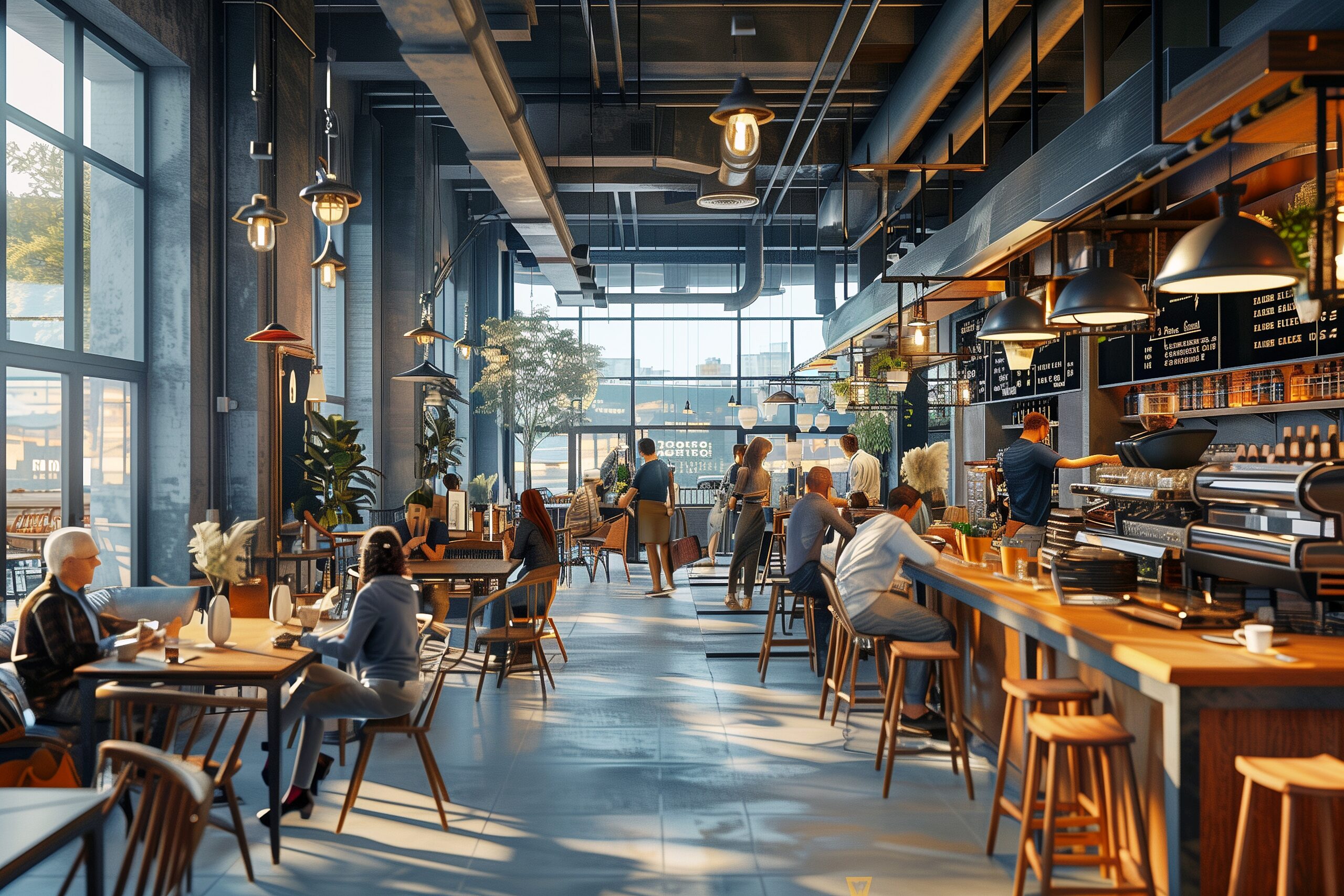 検索タグ:カフェ、インテリア、cafe、interior、店内、飲食店、オシャレ、お洒落、おしゃれ、室内、屋内、内装、内観、フリー素材、フリー画像、AI生成画像、木のテーブル、シンプル、コピースペース、賑わう、賑わい、繁盛、人気店、人々、男女、広告、イメージ素材、たくさんの人
