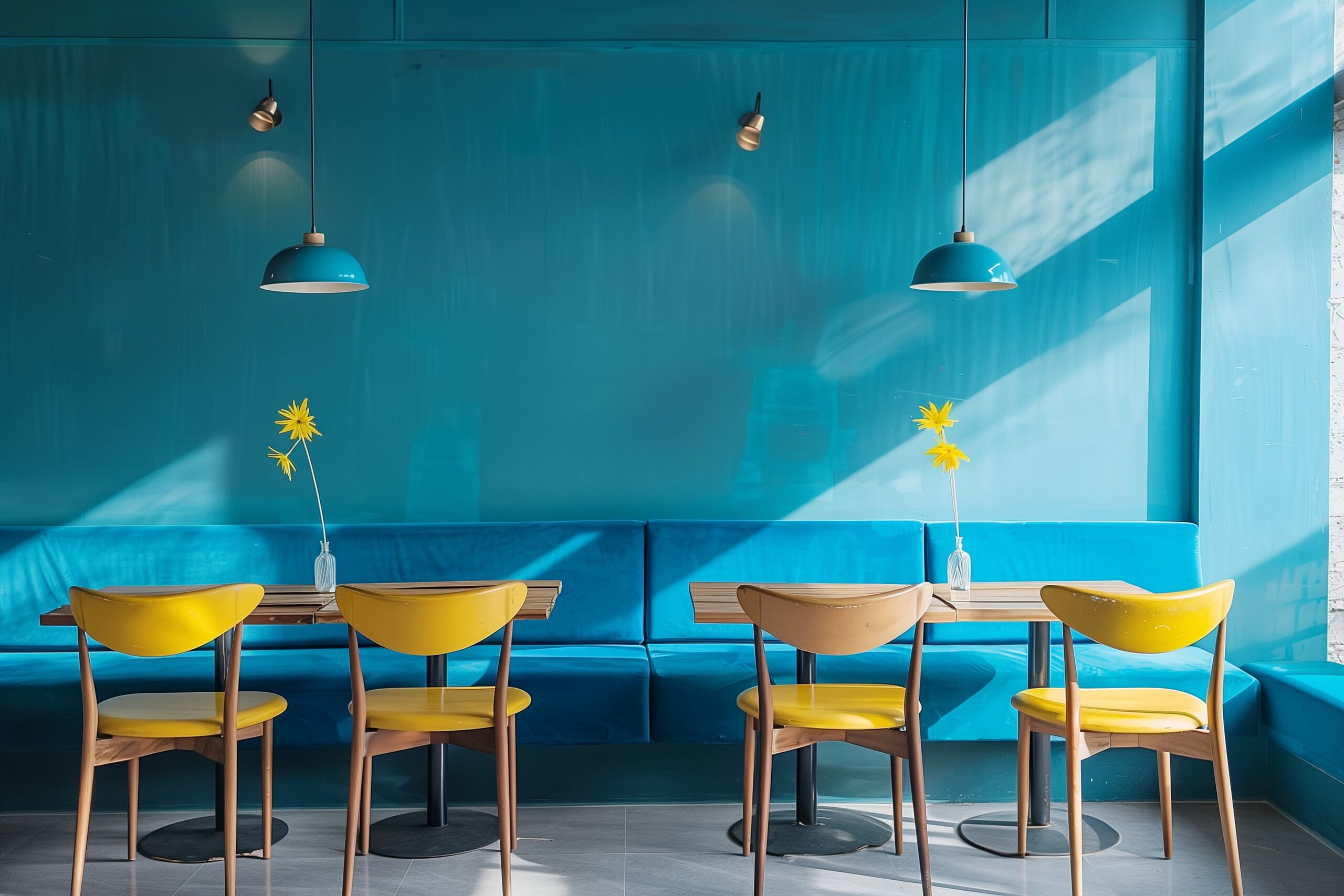 検索タグ:カフェ、インテリア、cafe、interior、店内、飲食店、オシャレ、お洒落、おしゃれ、室内、屋内、内装、内観、フリー素材、フリー画像、AI生成画像、木のテーブル、シンプル、コピースペース、レトロ感、青、ブルー、Blue