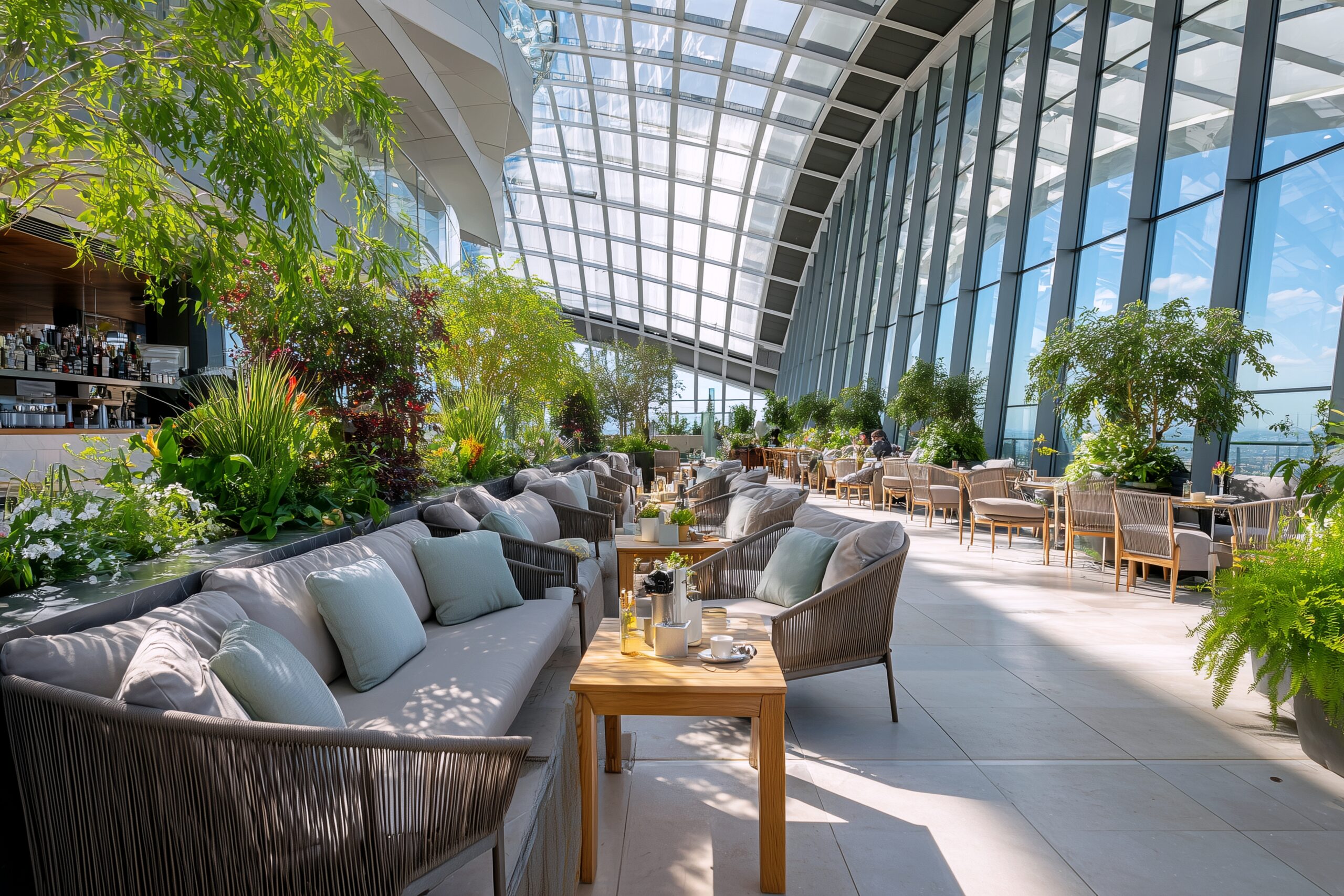 検索タグ:カフェ、cafe、飲食店、オシャレ、お洒落、おしゃれ、建物、建築、お店、店舗、フリー素材、フリー画像、AI生成画像、喫茶店、秋、Autumn、オータム、モダン、季節、free image、インテリア、innteria、内装、内観、背景素材、背景画像、Zoom背景、配信背景、ソファ席、空中庭園、開放的、広い、高級感