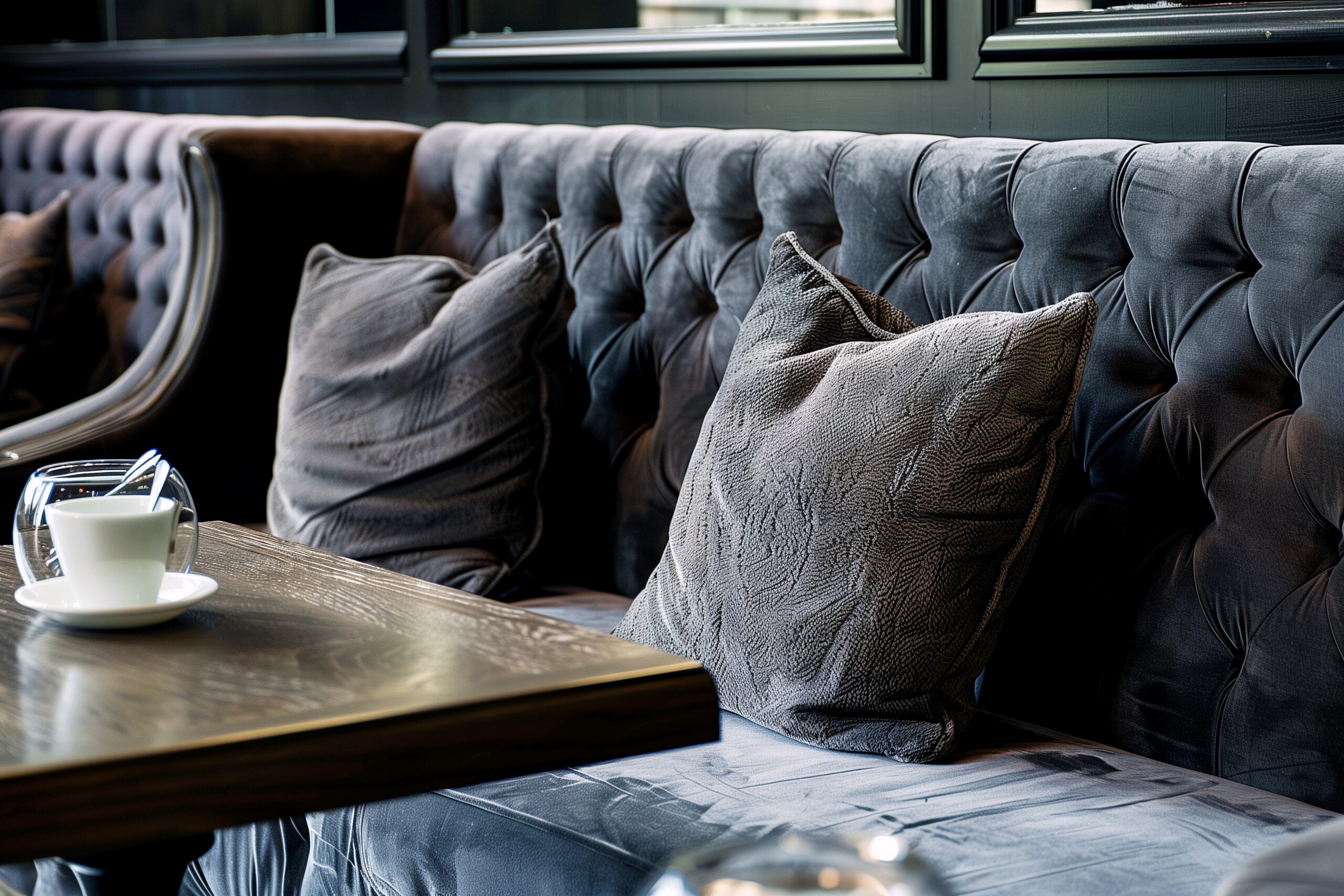検索タグ:カフェ、インテリア、cafe、interior、店内、飲食店、オシャレ、お洒落、おしゃれ、ソファ席、室内、屋内、内装、内観、フリー素材、フリー画像、AI生成画像、ブラック、黒、高級感、テーブル席