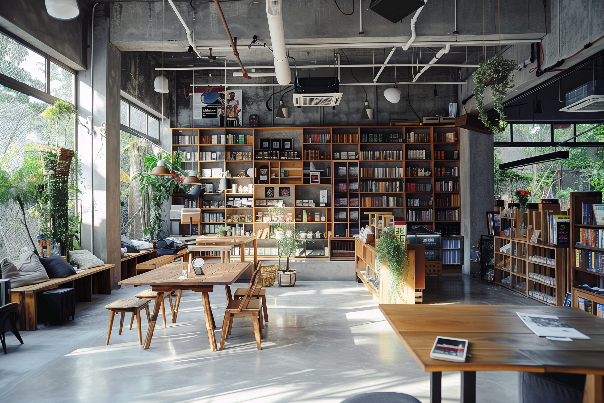 検索タグ:カフェ、インテリア、cafe、interior、店内、飲食店、オシャレ、お洒落、おしゃれ、ブックカフェ、本棚、フリー素材、フリー画像、AI生成画像、内装、内観、室内、店舗、お店