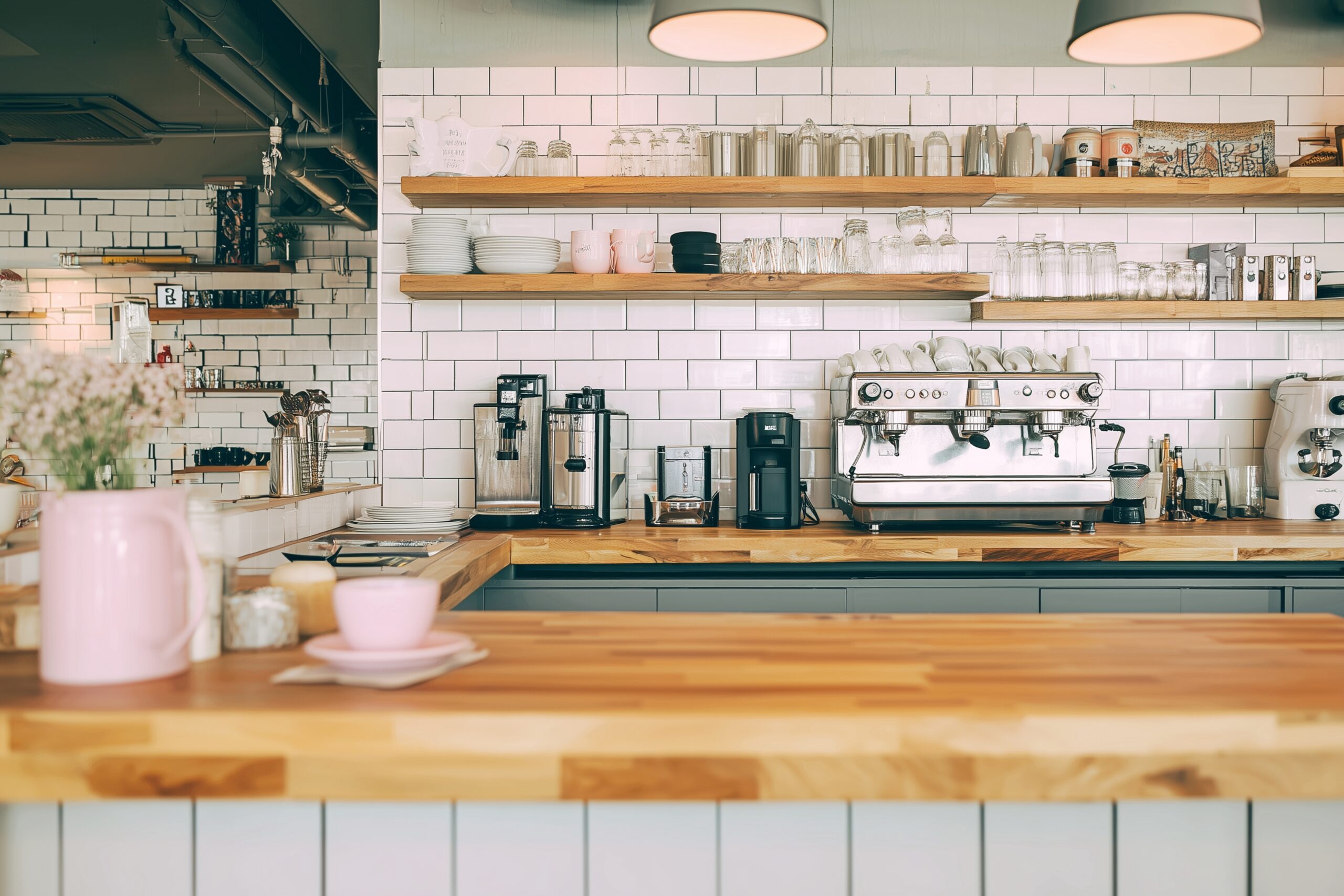検索タグ:カフェ、cafe、飲食店、オシャレ、お洒落、おしゃれ、建物、建築、お店、店舗、フリー素材、フリー画像、AI生成画像、喫茶店、モダン、free image、インテリア、interior、内装、内観、背景素材、背景画像、Zoom背景、配信背景、カウンターキッチン、調理場、カウンターテーブル