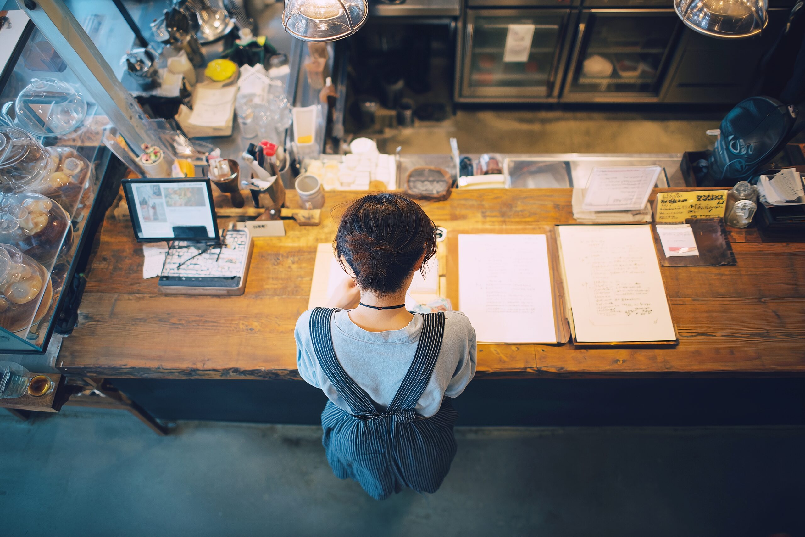 検索タグ:カフェ、cafe、飲食店、オシャレ、お洒落、おしゃれ、お店、店舗、フリー素材、フリー画像、AI生成画像、喫茶店、free image、インテリア、innteria、内装、内観、人物、後ろ姿、カフェカウンター、アルバイト、店員、スタッフ、パート、レジ、バイト、女性、女の人、女の子、女