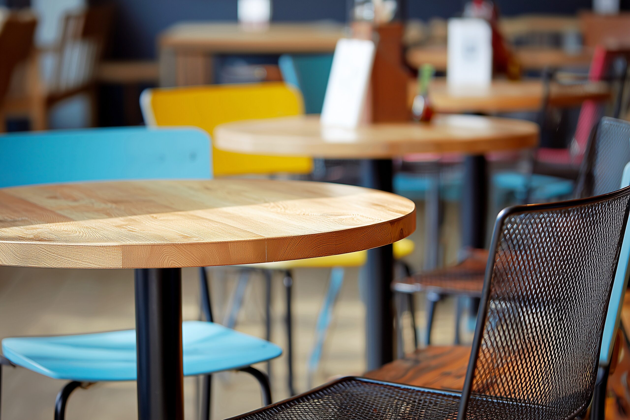 検索タグ:カフェ、cafe、飲食店、オシャレ、お洒落、おしゃれ、建物、建築、お店、店舗、フリー素材、フリー画像、AI生成画像、インテリア、内装、内観、喫茶店、机、テーブル、カフェテーブル、椅子、チェア、席、テーブル席、シンプル